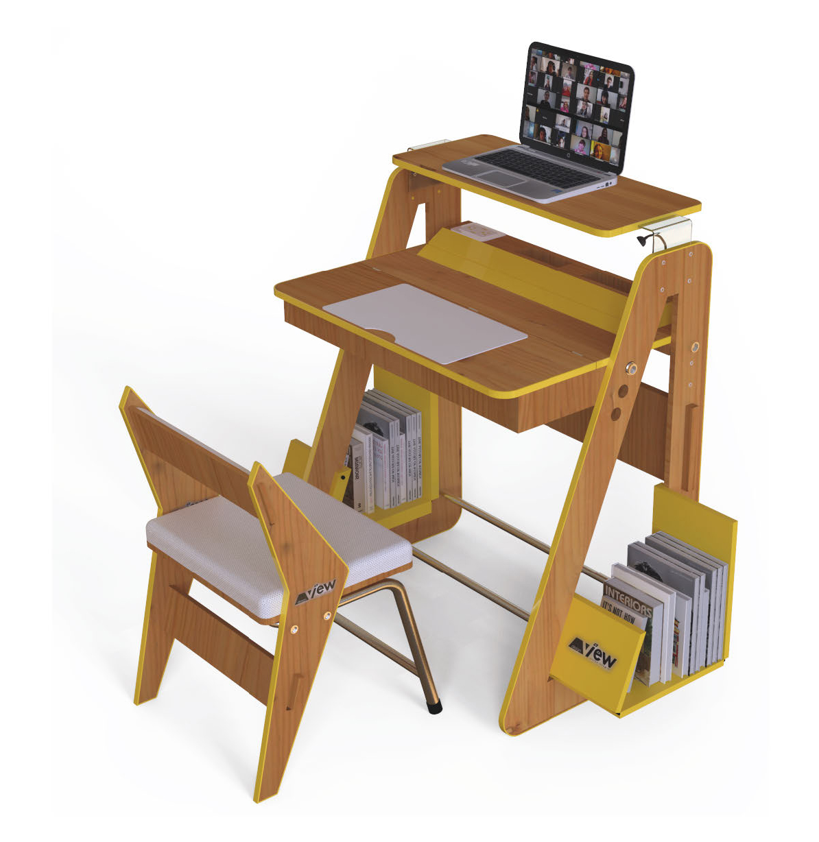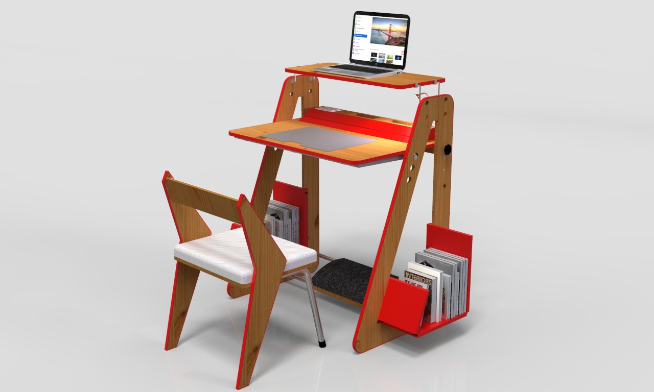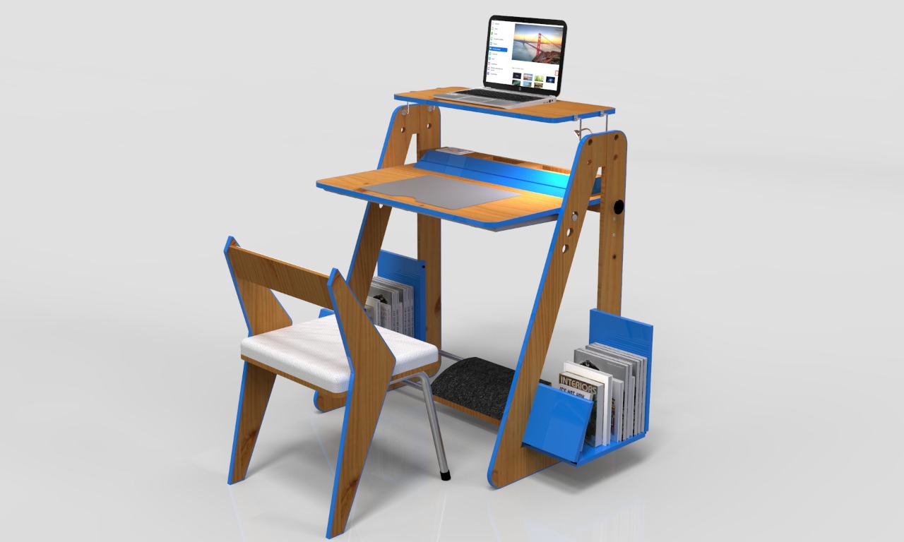 Estación de trabajo diseñada para estudiantes que necesitan de un espacio adecuado para desarrollar las actividades académicas dentro del hogar. Basada en conceptos de posición ergonómica y antropomórficos de los usuarios de entre 8 a 16 años.